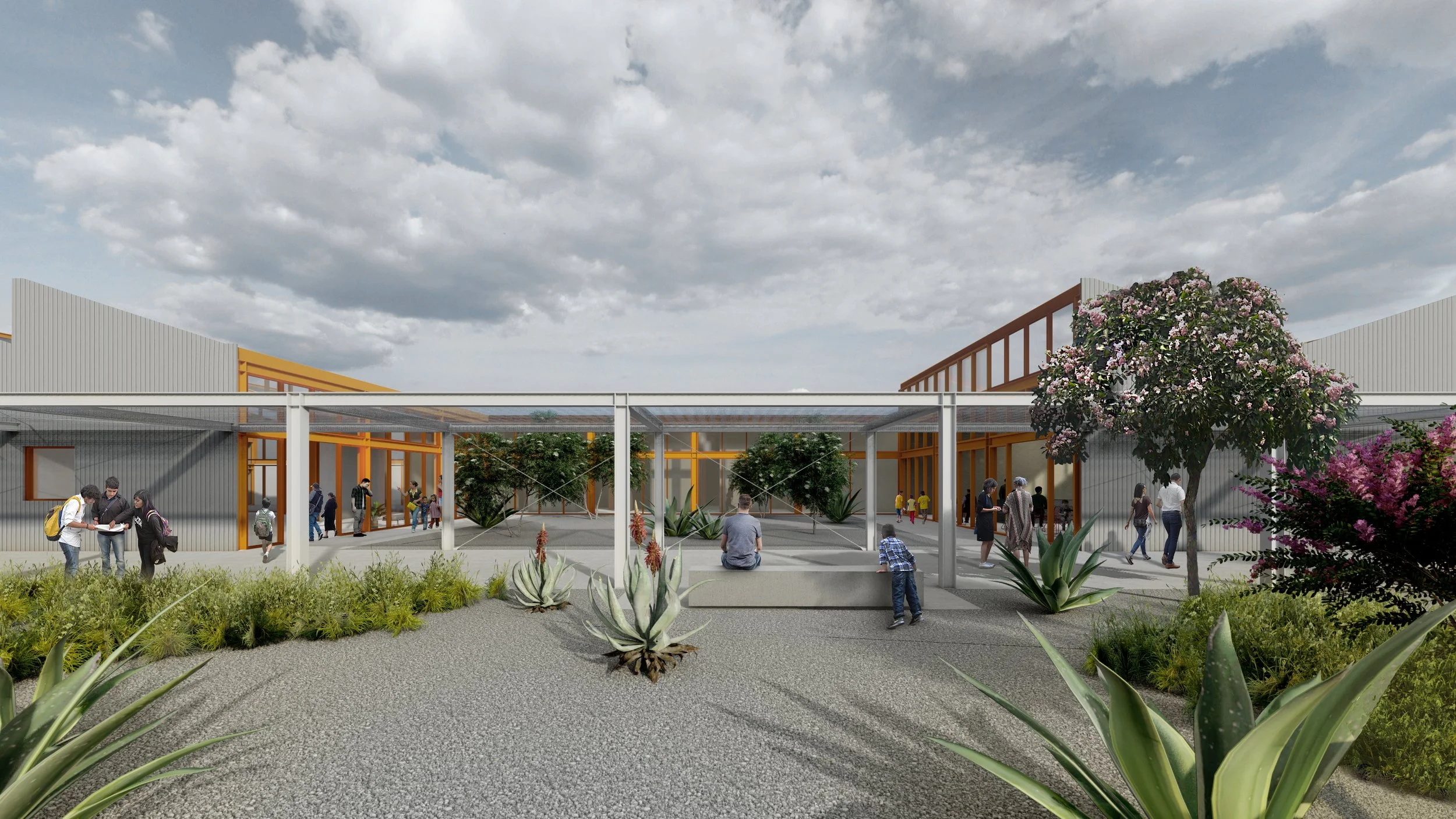 The Elena Poniatowska Agora and Library is a 222-meter-long public complex located just north of Mexico City, 10km away from the new Felipe Ángeles International Airport (AIFA). The project inserts a new pedestrian axis within an existing superblock-sized urban parcel, and contains a range of public programs relating to healthcare, arts, culture, and education. The pedestrian axis functions as both urban plaza and park. Arid gardens, seating, and lightweight metal pergolas cut down the site north to south and link to three new single-level buildings.